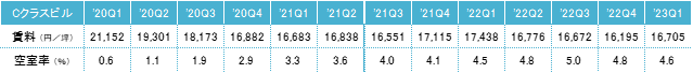 2023年第1四半期のCクラスビル賃料は前期比プラス510円/坪の16,705円/坪(共益費除く)となった。4期ぶりで小幅に上昇したが、賃料は2020年第4四半期以降、横ばい傾向が見られる。