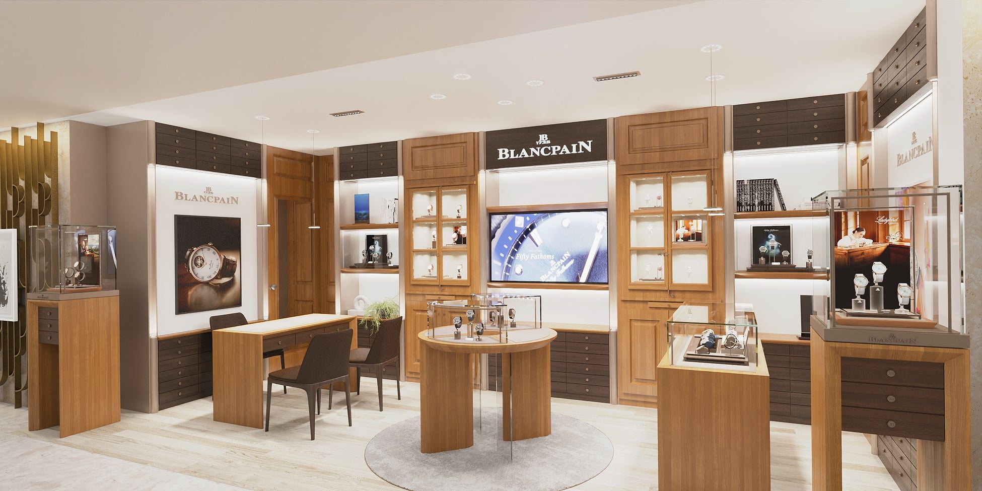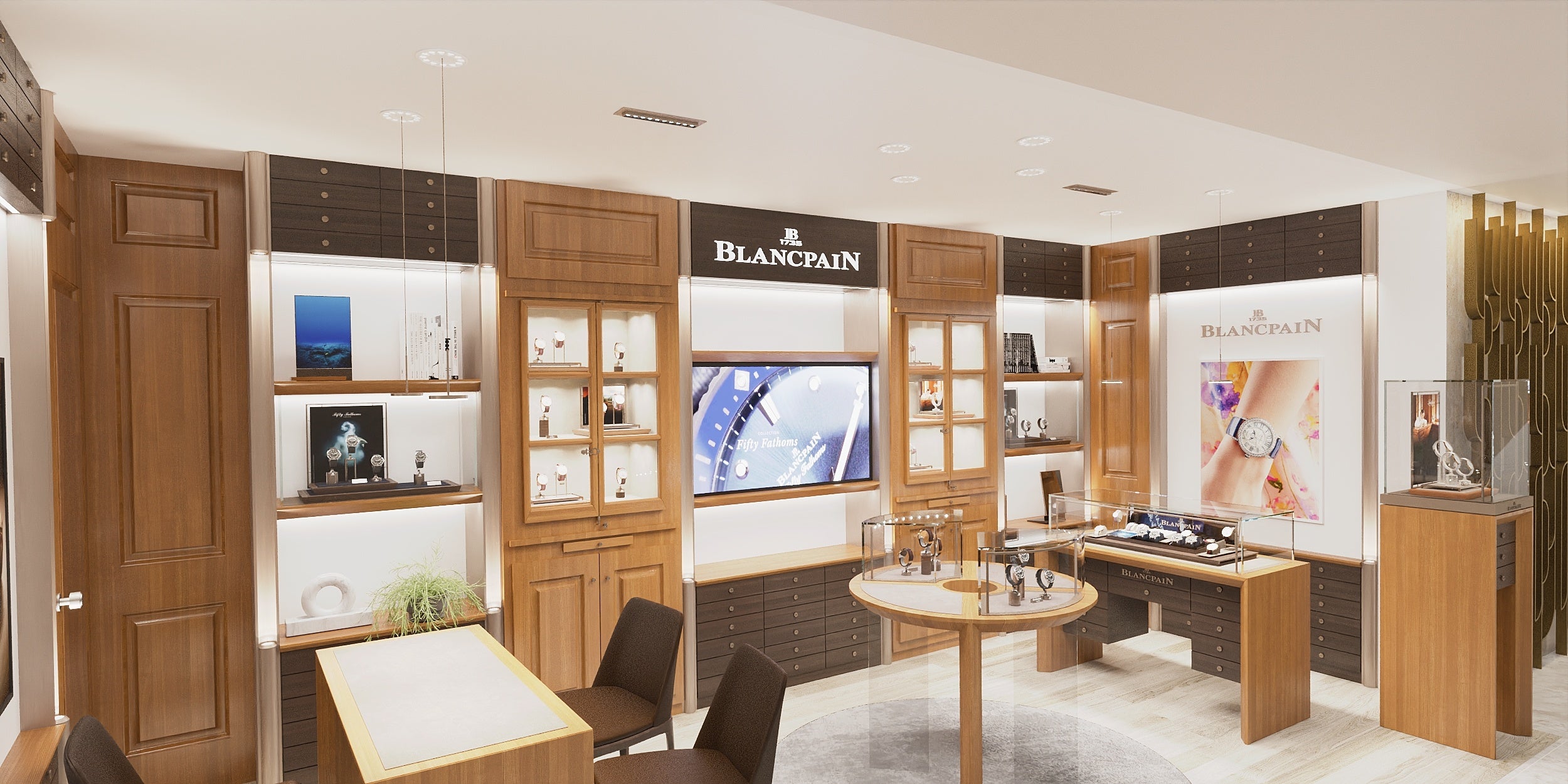 〈ブランパン〉が培ってきた280年以上の伝統、そして「革新こそ伝統」というブランド哲学を余すことなく表現した店内は、ジュウ渓谷にある〈ブランパン〉の工房をイメージしたデザインを基調に上質なチェリーの木工細工を使用しています。温もりを感じさせる雰囲気の中、居心地の良いラグジュアリーな空間を演出しています。