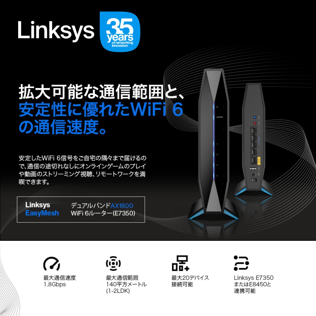 Linksysは、信頼性とセキュリティ性に優れたネットワークおよびメッシュテクノロジーにより、卓越したWiFiエクスペリエンスを提供しています。とりわけ、当社の製品は有効性に優れています。どこでどんな状況で利用しても、LinksysのWiFiには無駄な複雑さが一切ないので、誰でも簡単に、お気に入り動画のストリーミング視聴を楽しんだり、インターネット上で副業を立ち上げたり、人生の大切な一瞬に心を通わせ合ったりできるのです。当社は1988年の創業以来、業界をリードするネットワーク機器のブランドとして、WiFi製品の提供によってお客様の暮らしや活動を支えています。弊社におきましても、警視庁発表の「家庭用ルーターの不正利用に関する注意喚起」の取り組みに賛同するとともに、注意喚起を行ってまいります。