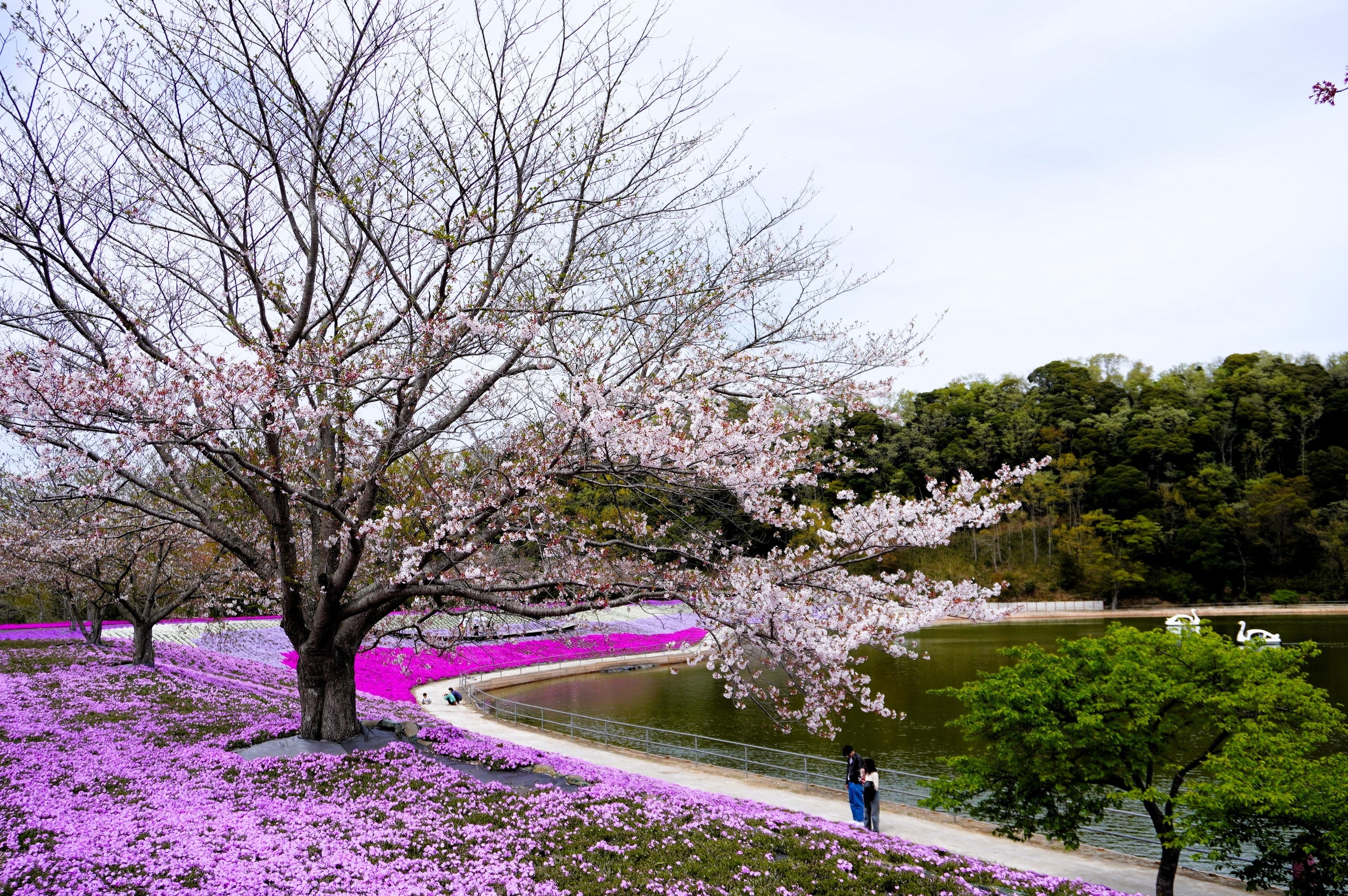 スワンボートからのお花見や、池の水面に映る逆さ芝桜の鑑賞もおすすめです。また、花びらの一つ一つがかわいらしく、遊歩道をお散歩しながら春を感じていただけることと思います。