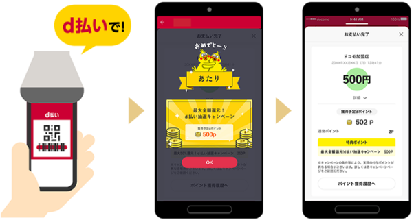 対象のお支払いが完了すると、「d払い」で自動抽選が行われ、画面内で抽選結果を表示します(※4)。