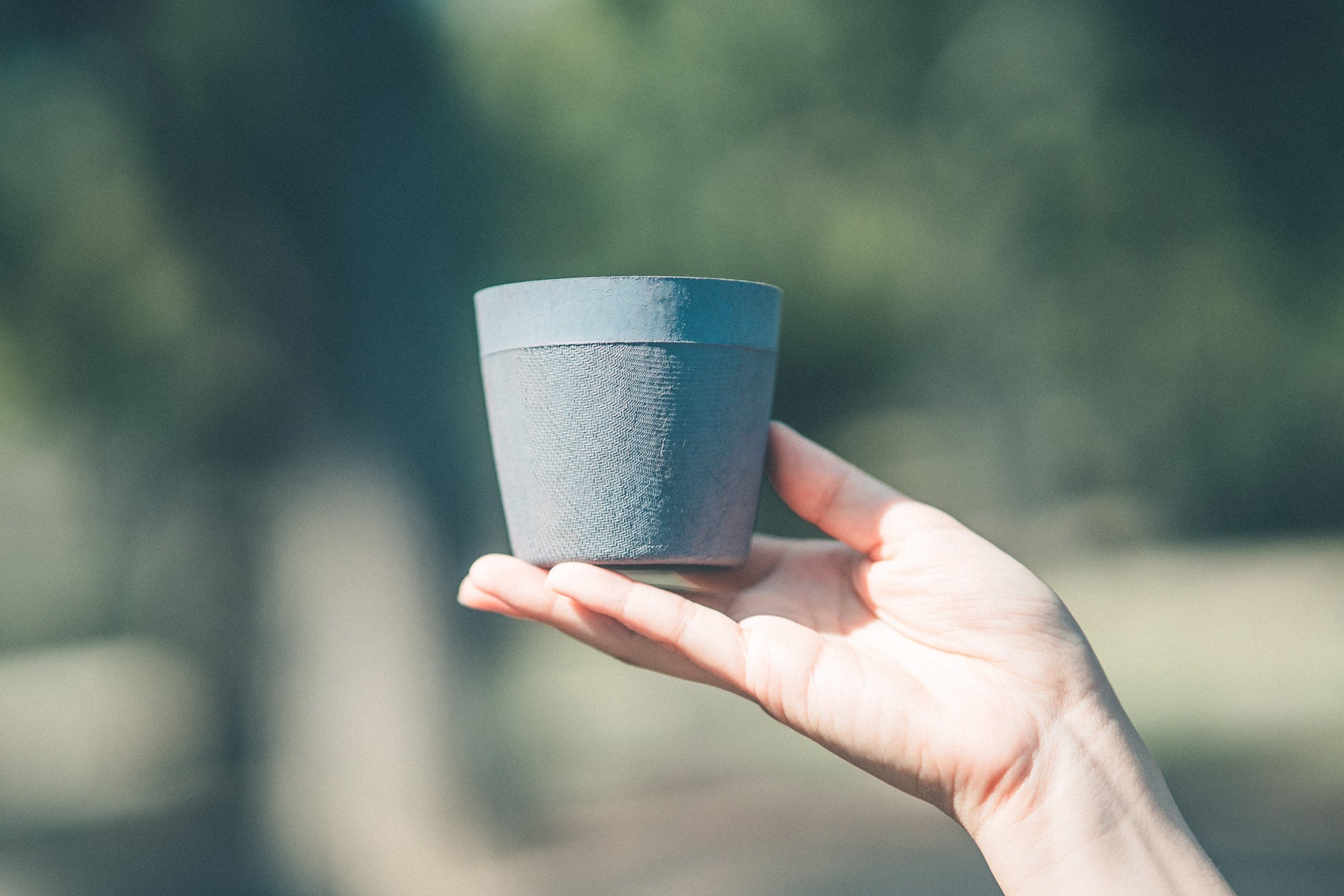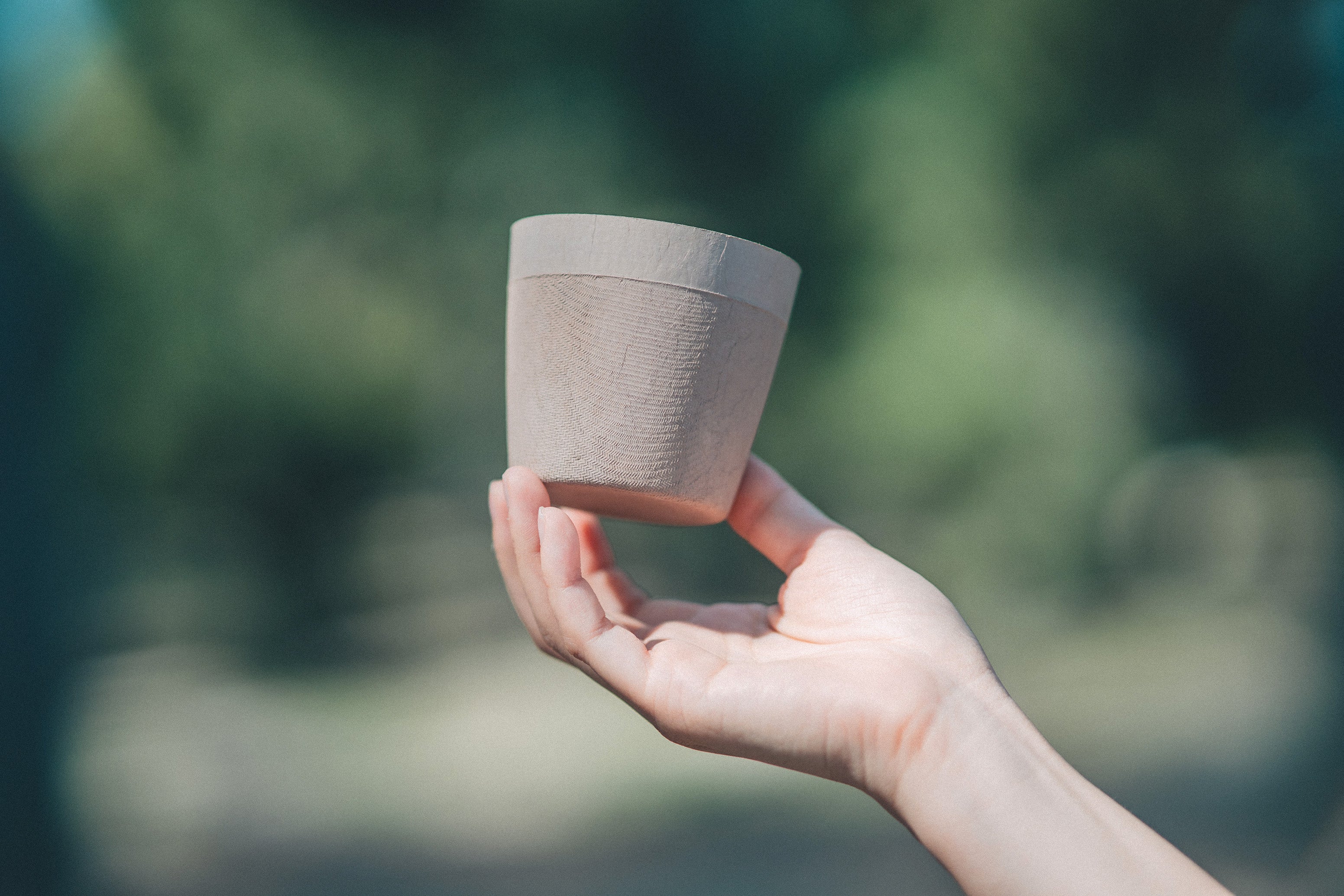 やさしいカラーリングとやわらかい質感の本カップは、京都・西陣の色漆技術と新しい漆コーティング技術によるもの。京都の老舗、佐藤喜代松商店の発色性の高い色漆に、従来の漆塗り概念を覆した、新しい焼付け漆塗布を掛け合わせることで、紙ならではのあたたかいテクスチャーはそのままに、本来では難しいとされてきた天然漆での淡いパステル調の色味を実現しました。