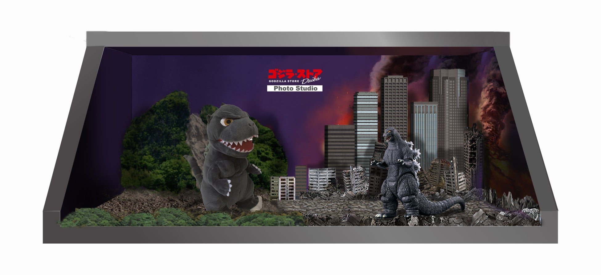 ストア内に、怪獣フィギュアで遊べるフォトスタジオを用意しました。手持ちのフィギュアやぬいぐるみを置いて、オリジナルのゴジラワールドを撮影できます、このスタジオを制作したのは、実際のゴジラ映画の美術を担当している東宝映像美術です。ミニチュアサイズですが、臨場感はバツグン!