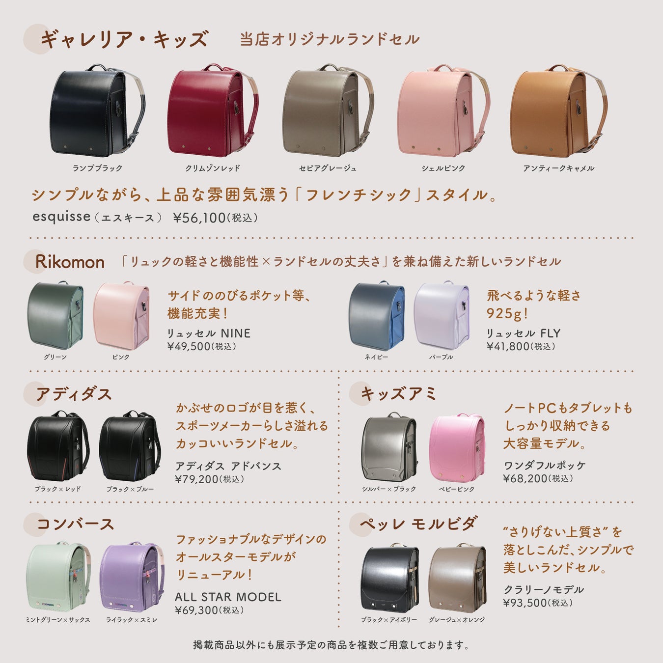 ギャレリアオリジナルのランドセル「ギャレリア・キッズ」をはじめ、リュックとランドセルのそれぞれの良いところを合わせた新しいランドセル「Rikomon」、ランドセル大手メーカーが手がけるブランド「キッズアミ」、スポーティーでアクティブなデザインの「アディダス」、鮮やかなカラーリングのファッショナブルな「コンバース」などなど、バリエーション豊かな彩り溢れるランドセルをご用意いたします。確かなものづくりと必要な機能が揃った高い品質のランドセル。さまざまなカラーパレットの中から、実際にお手に取りお試しいただけます。ぜひご家族みなさまで、お子さまのランドセル選びをゆっくりとお楽しみいただけたら幸いです。