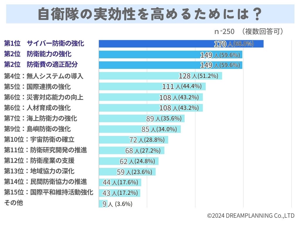 自衛隊の実効性を高めるための方策について調査したところ、最も多い回答が「サイバー防衛の強化」でした。