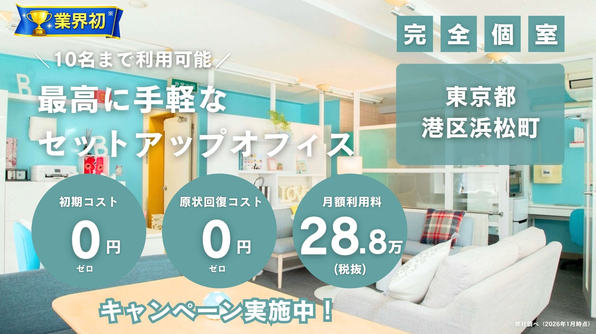 初期コスト0円・原状回復コスト0円、リーズナブルな価格設計、当月末払い相談可