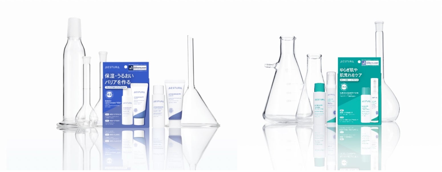 1つ目は、ブランドを代表する『アトバリア365』シリーズより、40年に渡る敏感肌研究から生まれた独自の保湿成分「高密度セラミドカプセル*3」を配合した韓国大人気クリーム「#120時間保湿クリーム」と、化粧水と美容液のいいとこどりをした「#まるで美容液なとろみ化粧水」の2点をミニサイズにした「アトバリア365 トライアルキット」。2つ目は、日本でも人気のあるシカ成分をAESTURA独自の配合と技術力により新しく生まれ変わらせた“進化系CICA”「CICA BPM™*4 」をシリーズ全てに含有している『エイシカ365』シリーズから、「CICA BPM™*4 」を細分化し角質層に素早く浸透する「#瞬間処方CICAセラム」と、手でなじませるだけでつるんとなめらか肌に整える「#摩擦レスCICAトナー」の2点をミニサイズにした「エイシカ365 トライアルキット」。