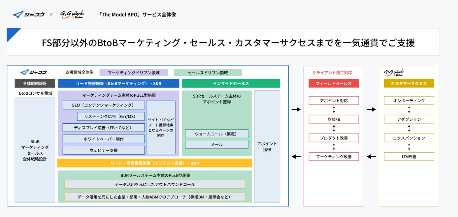 BtoB領域特化型でマーケティングからセールスまでを一気通貫で支援するBPaaS Growth Companyである株式会社シャコウ(代表取締役:太田翔葵)は、IT系のカスタマーサポート開始から30年の実績を基盤とするカスタマーサクセスソリューションサービス「Customer Bridge」を提供するギグワークスアドバリュー株式会社(ギグワークス株式会社(東証スタンダード 2375)子会社 代表取締役:福田和男)とBtoB企業のマーケティング・セールス・カスタマーサクセスのThe Model型業務プロセスを一気通貫して支援する「The Model BPO」を共同リリースいたします。