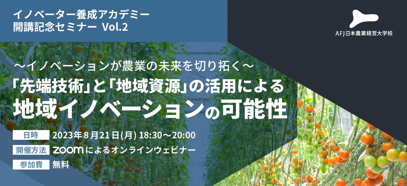 イノベーター養成アカデミー開講記念セミナー第二弾のお知らせ~イノベーションが農業の未来を切り拓く~「先端技術」と「地域資源」の活用による地域イノベーションの可能性