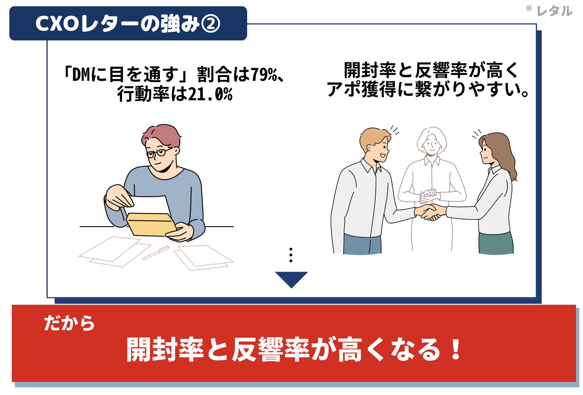 つまり CXOレターは、開封率と反響率が高く、アポイント獲得に繋がりやすい営業手法なのです。