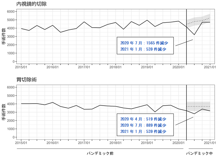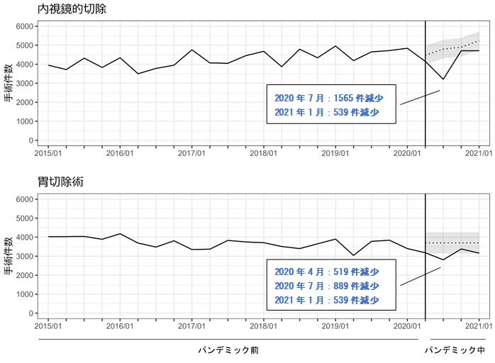 厚生労働省から2015年1月~2021年1月のNDBのサンプリングデータセット(年4回作成:1、4、7、10月)の提供を受けました。各胃がんの手術について、各月の診療報酬明細書(レセプト)(注3)の件数をカウントし、時系列分析(注4)という手法を用いて、パンデミック前の件数の推移から、パンデミック中の件数を予測するとともに(パンデミックがなかったと仮定した場合の件数の予測値)、パンデミック中の件数の変化量を推定しました。