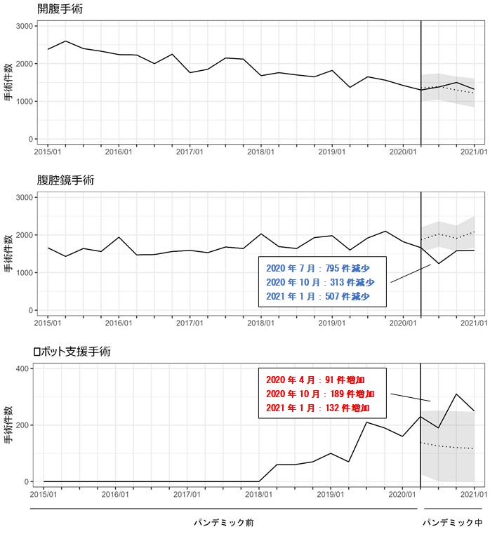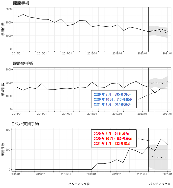 黒線:観察された手術数、点線:パンデミック前の推移から予測されたパンデミック中の件数(パンデミックがなかったと仮定した場合の予測値)、灰色の網掛け:95%信頼区間(観察された手術数が網掛けの外の場合、統計学的に有意に変化していると判断する)