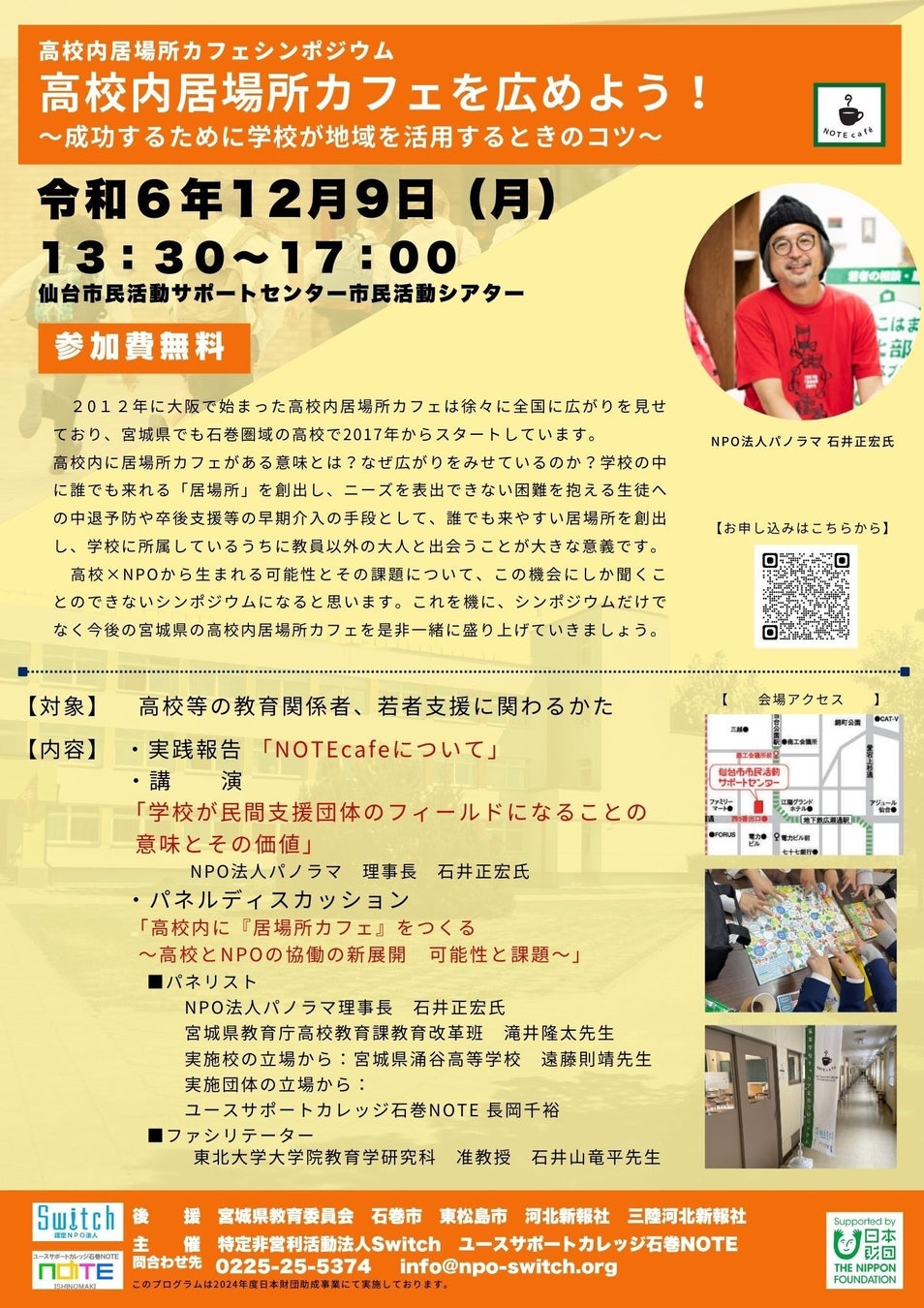 このシンポジウムでは、先駆者のひとりであるNPO法人パノラマ理事長石井正宏氏(神奈川県田奈高校;ぴっかりカフェ等)を講師として招聘して、高校内居場所カフェを実施・成功するための学校・実施団体との協働の在り方を示すとともに、宮城県高校教育課や実施校等の先生も含めたパネルディスカッションを開催し、宮城県内どこででも高校内居場所カフェがある環境の実現に向けた打ち手について検討します。多くの皆様のご参加をお待ちしております。