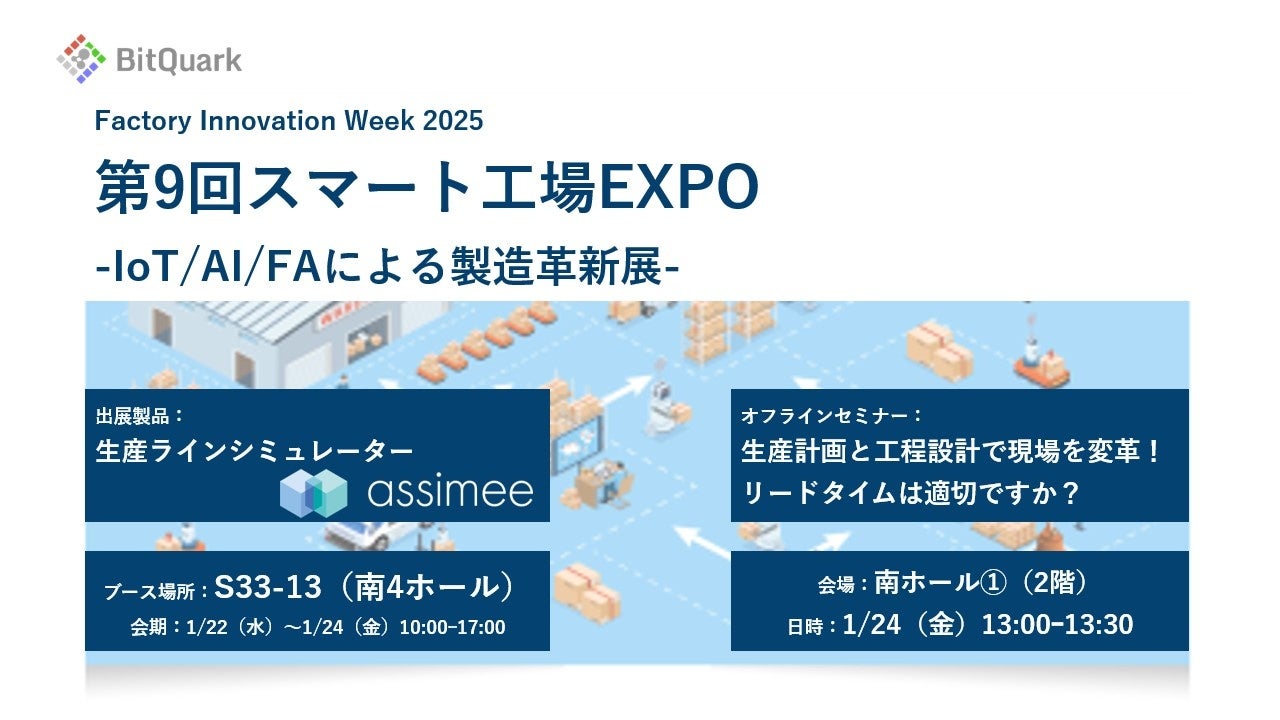 ビットクォーク株式会社(本社:東京都千代田区、代表取締役CEO:小森雄斗、以下「ビットクォーク」)は、2025年1月22日(水)から24日(金)に東京ビッグサイトで開催される「第9回スマート工場EXPO -IoT/AI/FAによる製造革新展-」に出展します。