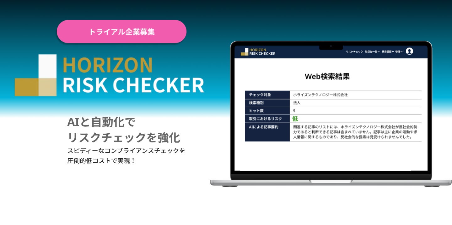「未来の世代に”強い日本”を取り戻す」をビジョンに掲げ、テクノロジーを活用した自社サービスの開発、クライアント企業の新規事業立ち上げ支援を行っているホライズンテクノロジー株式会社(所在地:福岡県福岡市⻄区、代表取締役:大谷祐司、以下ホライズンテクノロジー)は、AIによるコンプライアンスチェック自動化サービス「ホライズン リスクチェッカー」の無料トライアル企業を【10社限定】で募集します。