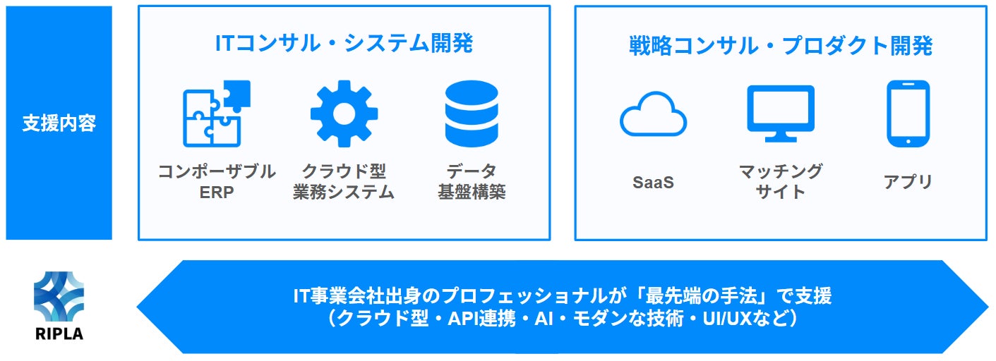 リプラは企業成長に伴走する「デジタル共創パートナー」です。SaaSやマッチングサイト・業務システムの立ち上げ支援サービスである「Boxシリーズ」や、システム開発・プロダクト開発をモダンな手法で支援する「デジタル共創支援」を提供しております。