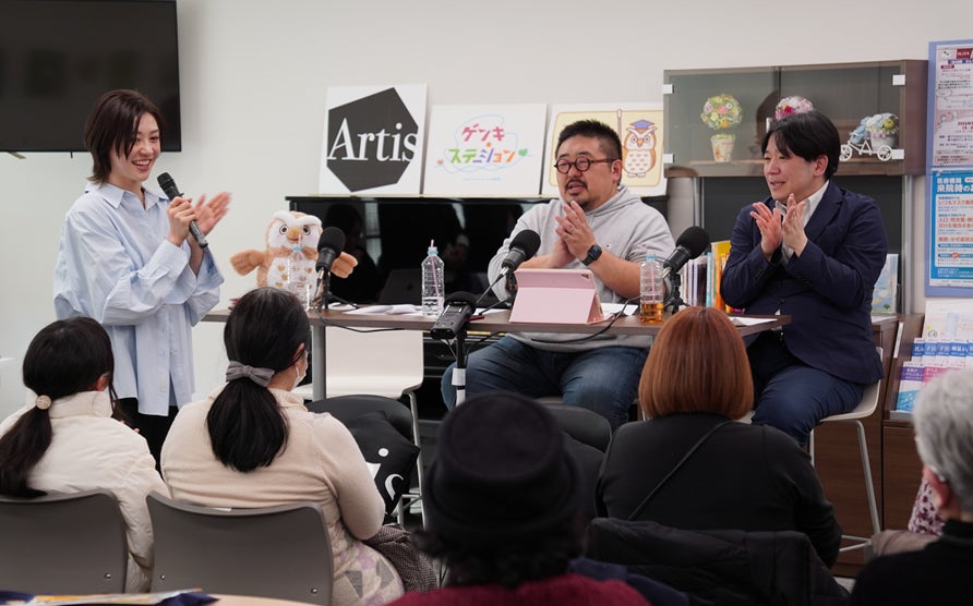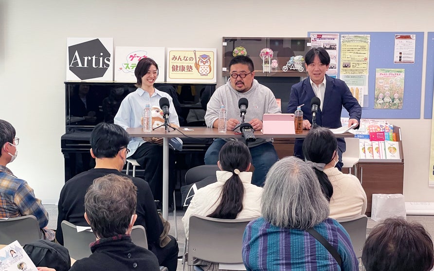 当日は『ゲンキ・ステーション』に出演中のアーティストである潤花さん(俳優)、矢野了平さん(構成作家・クイズ作家)、日髙大介さん(クイズ作家)の3名が登壇。会場に集まった地域住民の皆さまと共に、健康にまつわるクイズ企画や、日常を元気にする秘訣についてのトークセッションを行いました。