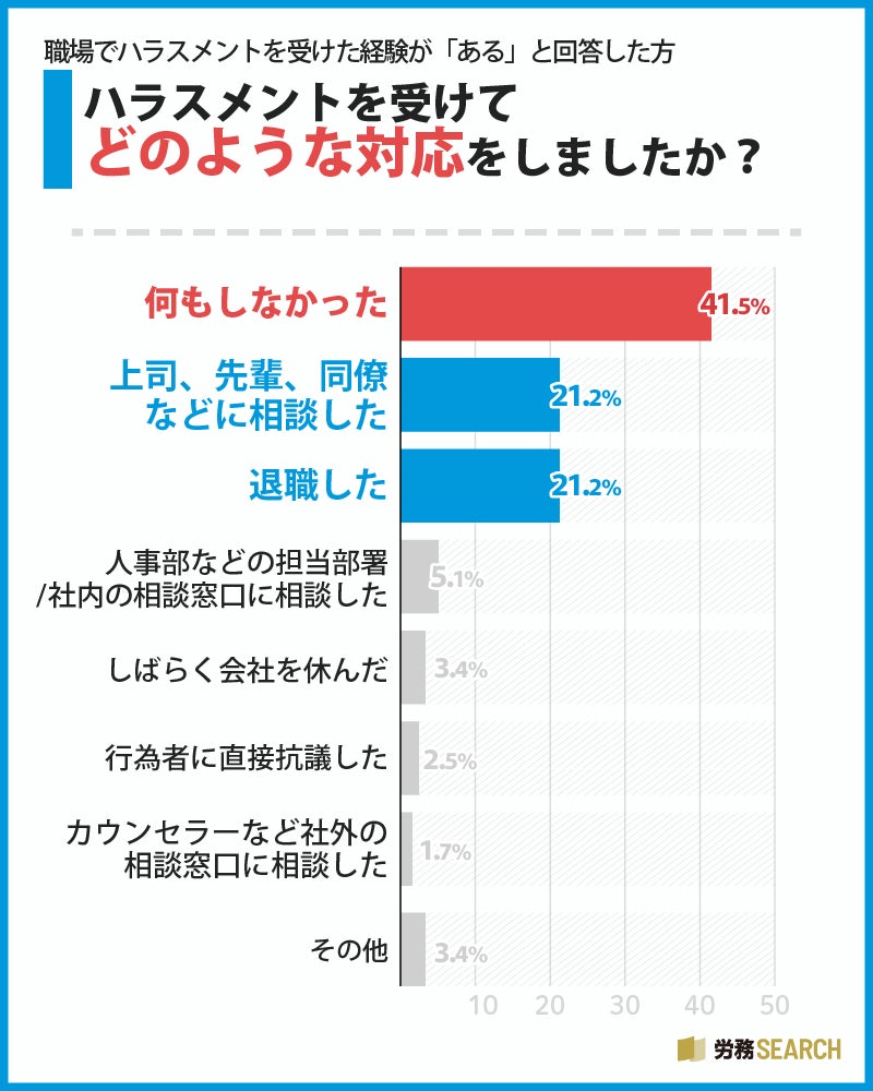 ハラスメントを受けた後の自身の対応について質問してみたところ、約4割の方がハラスメントを受けた後に何もしなかったことが明らかになりました。また「上司、先輩、同僚などに相談した」と「退職した」が同率2位という結果になり、ハラスメント被害を報告せずに自ら退職してしまう方も多いことが調査結果から伺えます。
