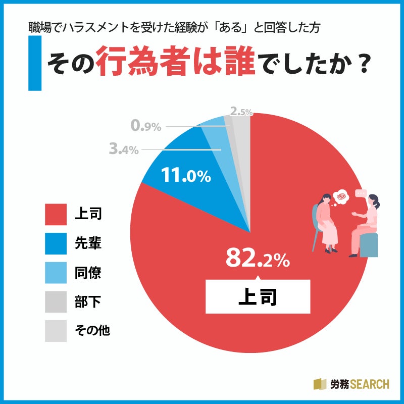 次に、ハラスメントをおこなったその行為者について聞いてみたところ、第1位は「上司」で82.2%、第2位は「先輩」で11.0%、第3位は「同僚」で3.4%という結果でした。ほとんどのケースでは、上司が部下に対してハラスメントをおこなっているようです。