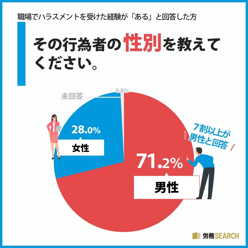なお、その行為者の性別については「男性」が7割以上という結果でした。しかし女性従業員から女性従業員へのハラスメント数は、女性従業員から男性従業員へのハラスメント数よりも多い結果となりました。