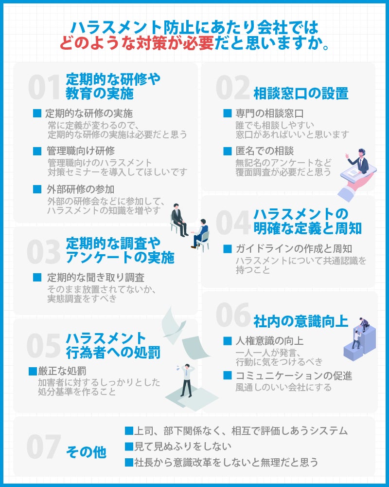 最後に、回答者全員にハラスメント防止にあたり会社ではどのような対策が必要だと思いますか?という質問をしてみました。その結果、企業によってはすでに実施している対策も上がった他、「社内の意識向上」や「ハラスメント行為者への処罰」などの意見も上がりました。