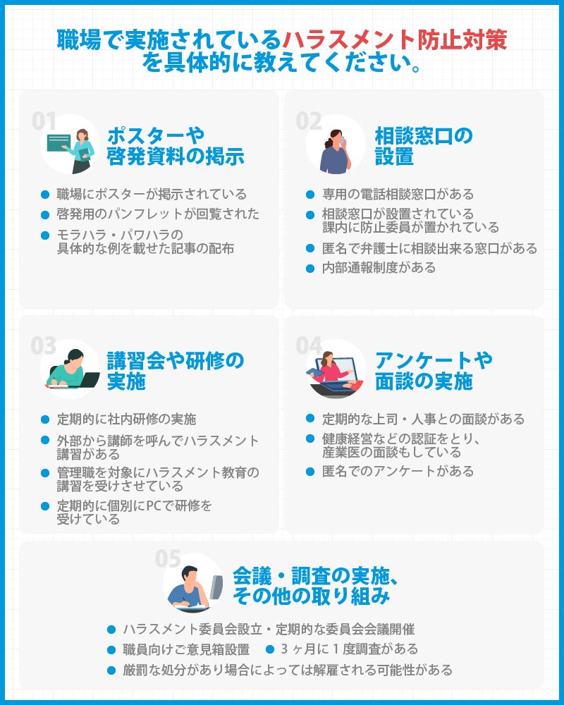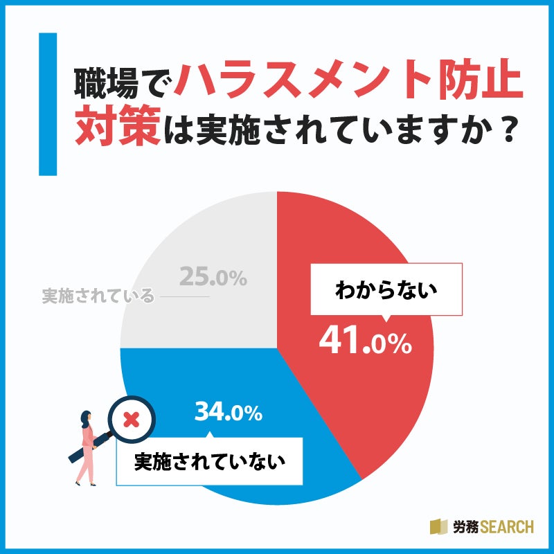 職場のハラスメント防止対策については、実施状況が「わからない」方が41.0%、「実施されていない」と回答した方が34.0%、「実施されている」と回答した方が25.0%という結果になりました。「実施されている」と回答した方には、その対策について具体的に聞いてみたところ、各企業が実施しているハラスメント防止対策は大きく以下の5つに分類できました。