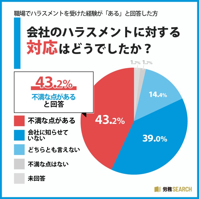 続けて、会社のハラスメントに対する対応はどうでしたか?という質問をしてみたところ、「不満な点がある」が43.2%、「会社に知らせていない」が39.0%、「どちらとも言えない」が14.4%、そして「不満な点はない」が1.7%という結果になりました。