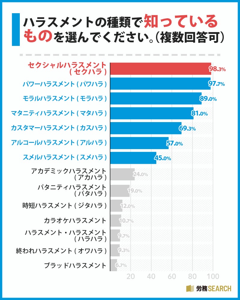 その他「モラルハラスメント(モラハラ)」が89.0%、「マタニティハラスメント(マタハラ)」が81.0%、「カスタマーハラスメント(カスハラ)」が69.3%、そして「アルコールハラスメント(アルハラ)」が57.0%と続きました。今回の調査で最も認知度が低かったハラスメントは、6.7%の方しか知らなかった「ブラッドハラスメント」でした。