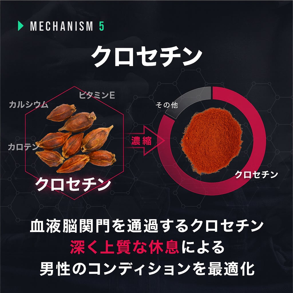 セラバスD6は加齢に伴うピーク時からの衰えをケアしたい男性に適した「テストサージ」や「フィトノックス」をはじめとして、日々のパフォーマンスには欠かせない良質な休息をサポートする「クロセチン」「GABA」「ベネトロン」「グリシン」 を採用した製品です。