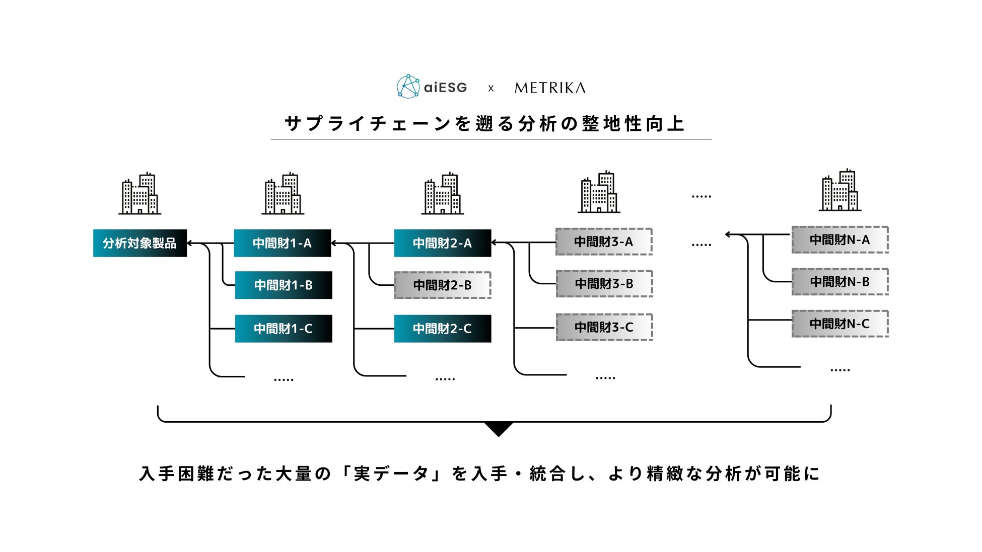 今回の協業を通じて、aiESGとMETRIKAは、手を取り合って、国際的および学術的に信頼された技術を基にしたESG分析サービスを、更に効率的かつ詳細に提供することができるようになりました。aiESGによる「材料コスト」や「使用量データ」を基礎とした企業及びその製品・サービスのサプライチェーン分析と評価、そしてMETRIKAによるデータ管理技術が相まって、1次取引先のみならず、2次取引先からn次取引先に至るまでのデータの収集と統合がスムーズになりました。これにより、トレーサビリティの確保、企業内の部門や事業部を超えた分散データの収集と統合を全面的にサポートし、製品・サービスのサプライチェーン情報から企業全体の情報まで、実データをより反映した徹底的に精密なESG分析サービスの提供を可能にしています。