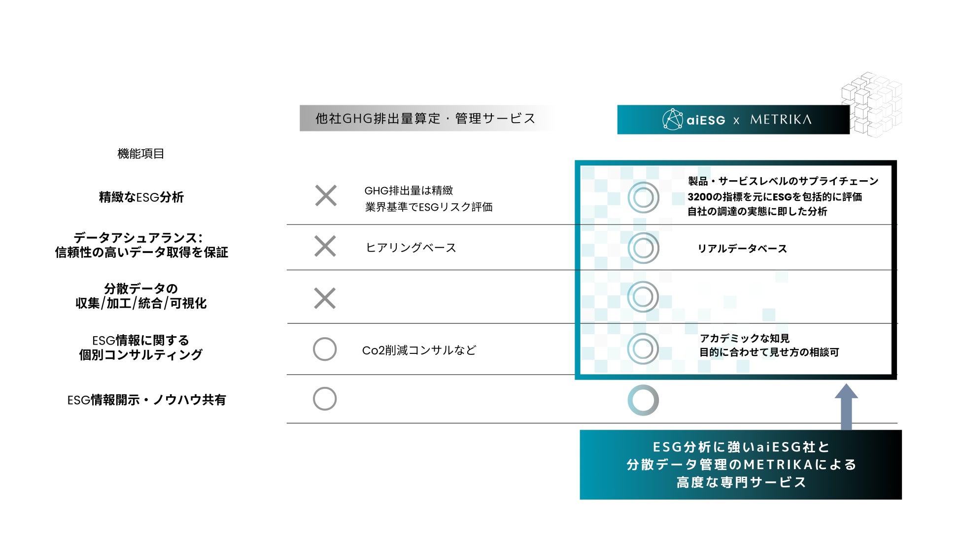 ESG定量評価を行う九州大学発スタートアップの株式会社aiESG (本社:福岡市博多区、代表取締役:馬奈木 俊介/以下「aiESG」)と、分散データ分析基設計・構築を支援するデータソリューションカンパニーの株式会社METRIKA(メトリカ)(本社:東京都渋谷区、代表取締役:小林 凌雅/以下「METRIKA」)は、ESG(環境・人権・ガバナンス)への関心の高まりに伴い、信頼性の高い精緻なESG評価サービスを提供するために協業いたします。国際的なサステナビリティ基準への迅速な対応に追われる企業の工数削減、効率化を目的とし、企業内に分散する膨大なデータの収集・統合から、学術的根拠をベースとした定量的ESG分析まで、一貫したサービスをご提供いたします。