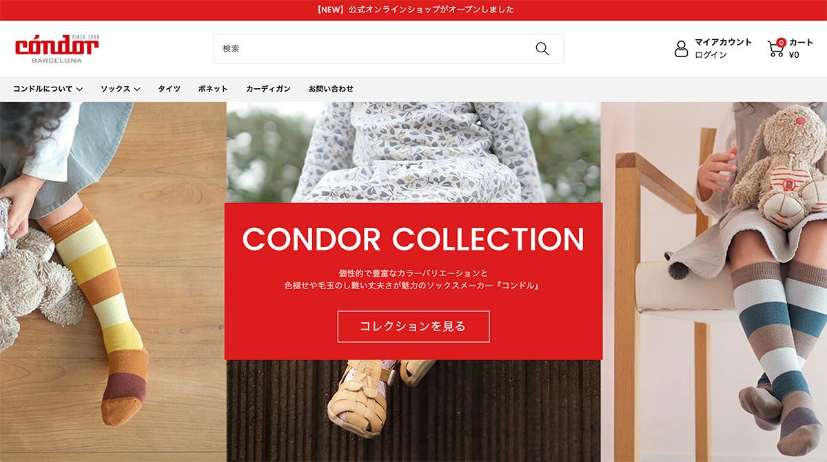 コンドルは、高品質なタイツやソックス、洋服を世界に発信する、スペインのファッションを代表する子供服ブランドです。1898年にバルセロナ近郊のアレニス・デ・マルで設立されたARETEX社が立ち上げたブランドで、現在60ヶ国以上の代理店を通じてに世界中に拡大しています。製品はすべてスペインの自社工場で生産され、環境に配慮した企業として極力天然の素材を使い、厳しいヨーロッパの繊維基準をクリアした素材を使用しています。現在、年間でおよそ500万足を超えるタイツ・ソックスを世界へ向けて作り続けています。