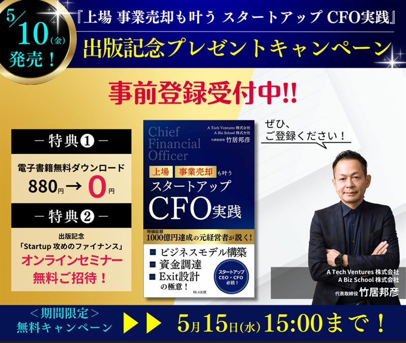 近年、スタートアップへの投資が活性化する中、スタートアップの成長を支えるCFOの役割がますます重要となっています。しかし、CFOの育成に関する情報は限られており、その需要は高まる一方です。この課題に資するべくスタートアップのビジネス教育に特化した事業を展開するA Biz School株式会社(本社:東京都新宿区、代表取締役 竹居邦彦)は、スタートアップの世界におけるCFOの役割や経験に焦点を当て、成功に向けた実践的なヒントや知識を解説した電子書籍『上場・事業売却も叶う スタートアップCFO実践(Kindle版)』を5月10日(金)に発売します。5月10日(金)17時からは、書籍の無料ダウンロードキャンペーンを開始します。