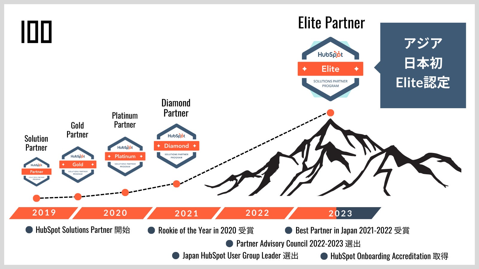 株式会社100は、「半歩先をてらす」をミッションに、2018年に創業し、2019年6月よりHubSpotの専門家・エキスパート集団として活動を開始して、2022年、HubSpot国内トップパートナーとして「HubSpot Best Partner in Japan」を2年連続で受賞しています。2023年7月にはHubSpot Onboarding Accreditation を取得し、同年8月、アジア初のHubSpot社のSolutions Partnerプログラムにおいて活動する企業の1%以下という狭き門のHubSpot Elite Partnerの基準をクリアし認定されるなど、アジア諸国No.1のHubSpotパートナー企業です。HubSpotを活用したRevOps(レベニューオペレーション)を軸に、SMBからエンタープライズまで幅広い企業のビジネスプロセスを可視化し効率化することで、ビジネス成長や収益向上を実現しています。