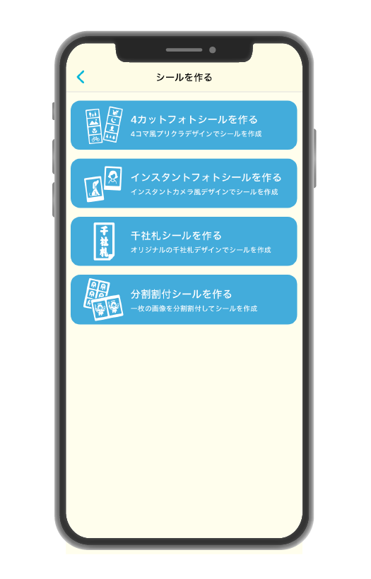 リリース以来、「お名前シール」「千社札シール」「4カットフォトシール」「インスタントフォトシール」「カレンダーシール」「QRコードシール」と、機能追加・バージョンアップを重ねて参りました。