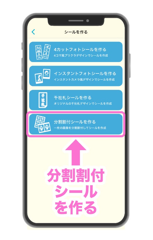 そして今回のバージョンアップでは、「千社札シール」「4カットフォトシール」「インスタントフォトシール」がつくれるアプリの<バラエティ>に「分割割付シール」作成機能が新たに加わりました。