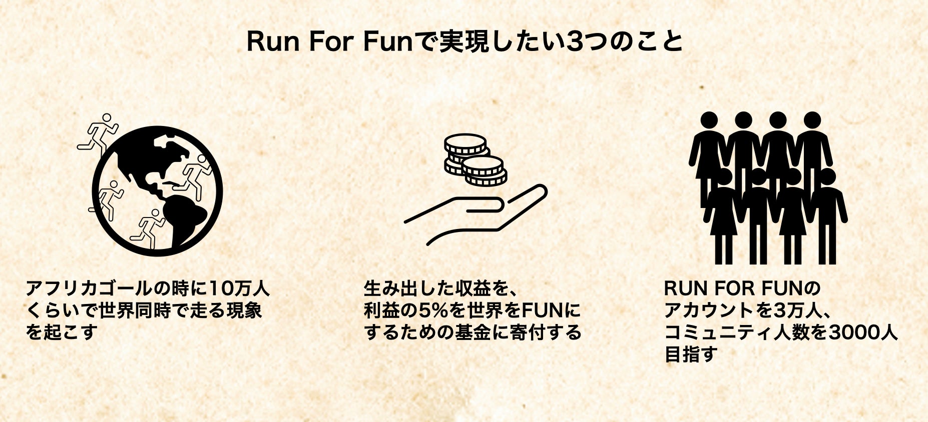 今回のプロジェクトは、ガンプ鈴木を中心に世界中でランニングを通じて楽しさと心身共に健康を広めることを目指します。私たちのミッションは、あらゆる年齢やスキルレベルの人々が参加でき、1人1人がRUNをするの喜びを発見し、共有する機会を創出すること世界をFUNにしていくことです。