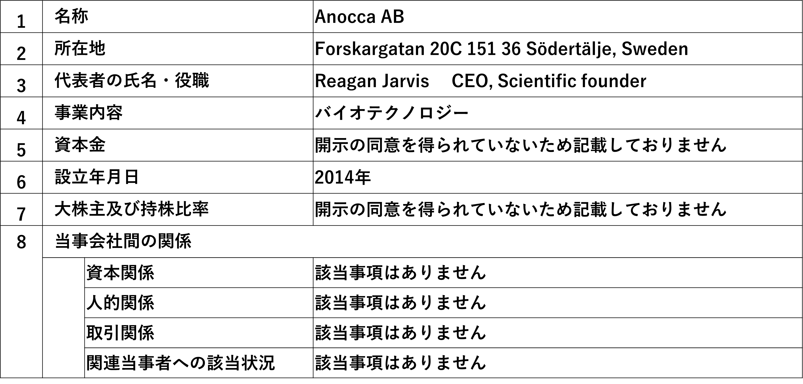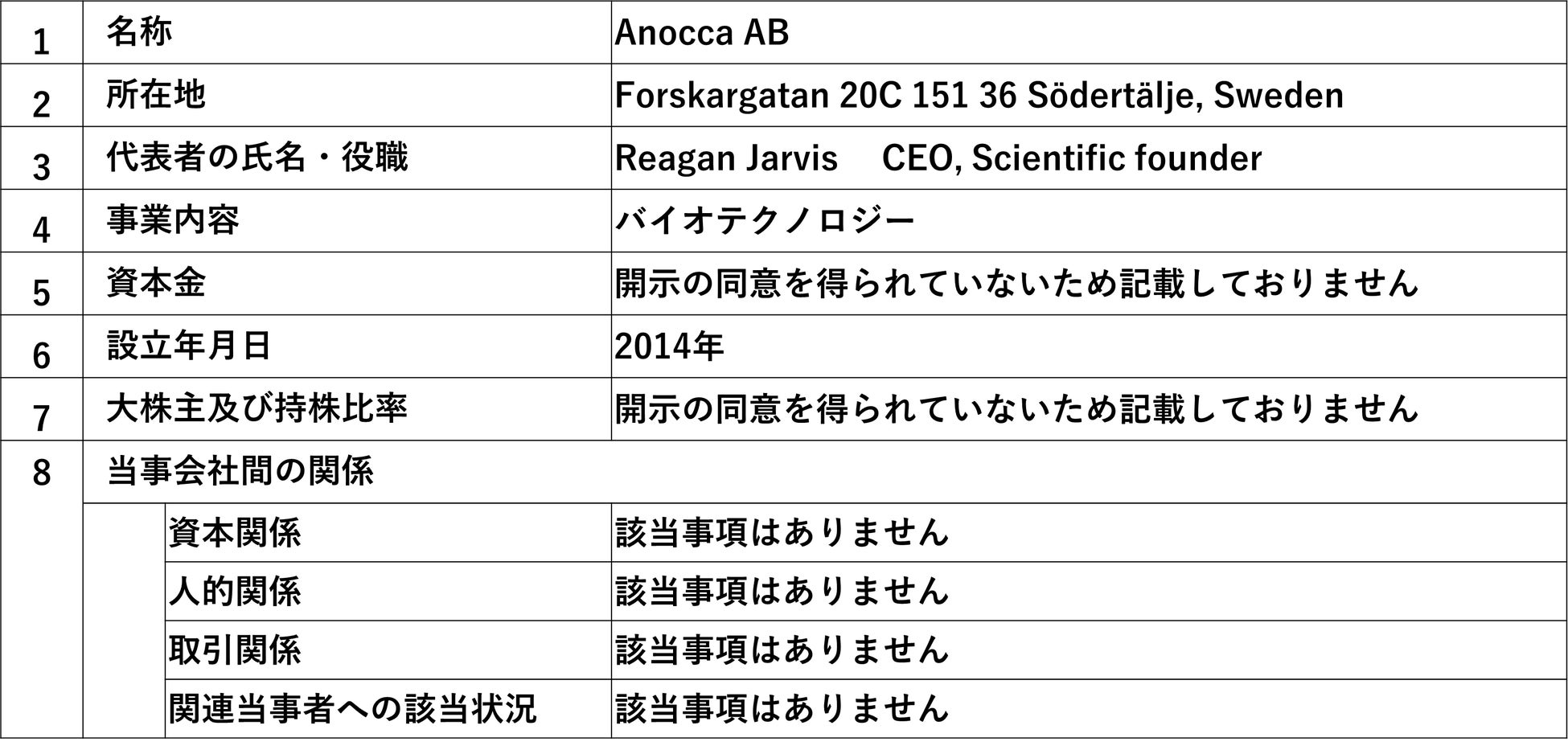 本日(3月14日)当社は、当社子会社のEmendoBio Inc.(以下、「EmendoBio社」という)が開発したゲノム編集のためのOMNIヌクレアーゼOMNI-A4の非独占的使用権について、EmendoBio社とスウェーデンのAnocca AB(Forskargatan 20C 151 36 Södertälje, Sweden:代表:Reagan Jarvis CEO, Scientific founder 以下、「Anocca社」という)がライセンス契約を締結することを決定いたしましたので、お知らせいたします。
