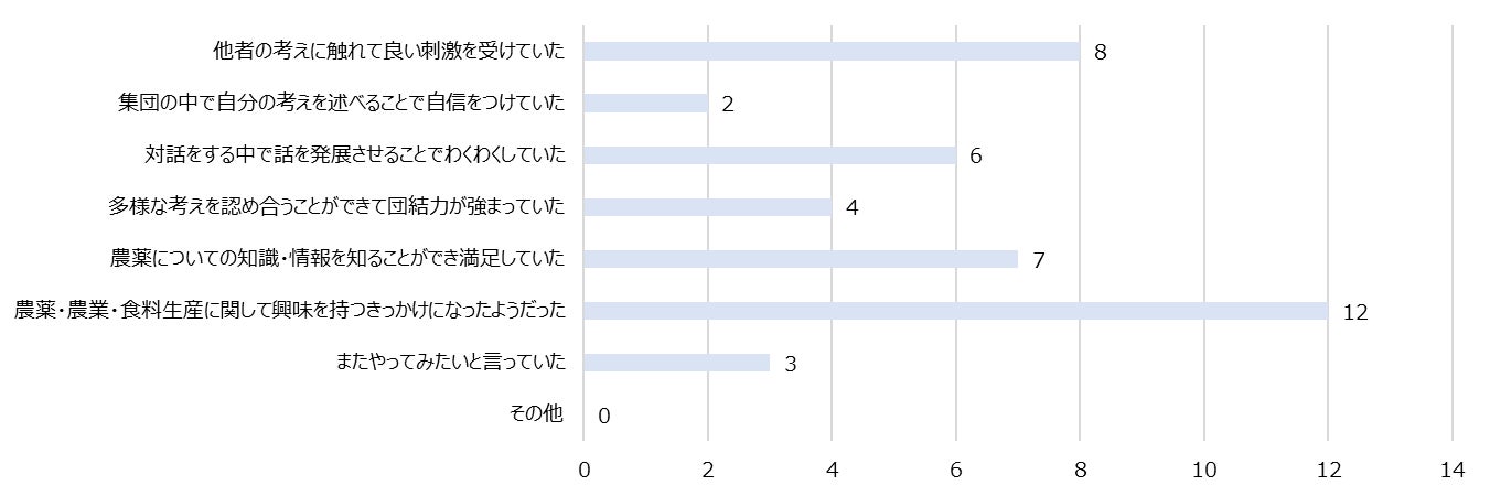 ・普段何気なく食べている食材に農薬が使われていることを知り、農薬の是非両方を知ることができた。個人の選択や日本の環境について考えが及ぶようになった。