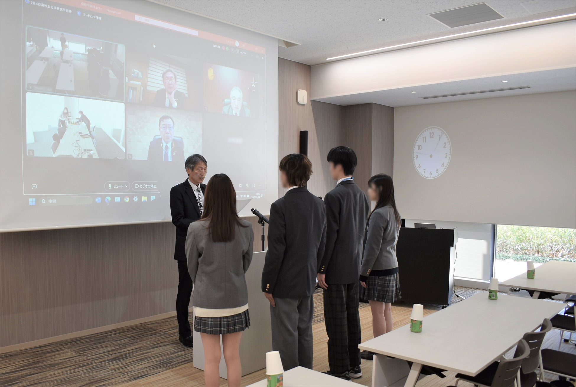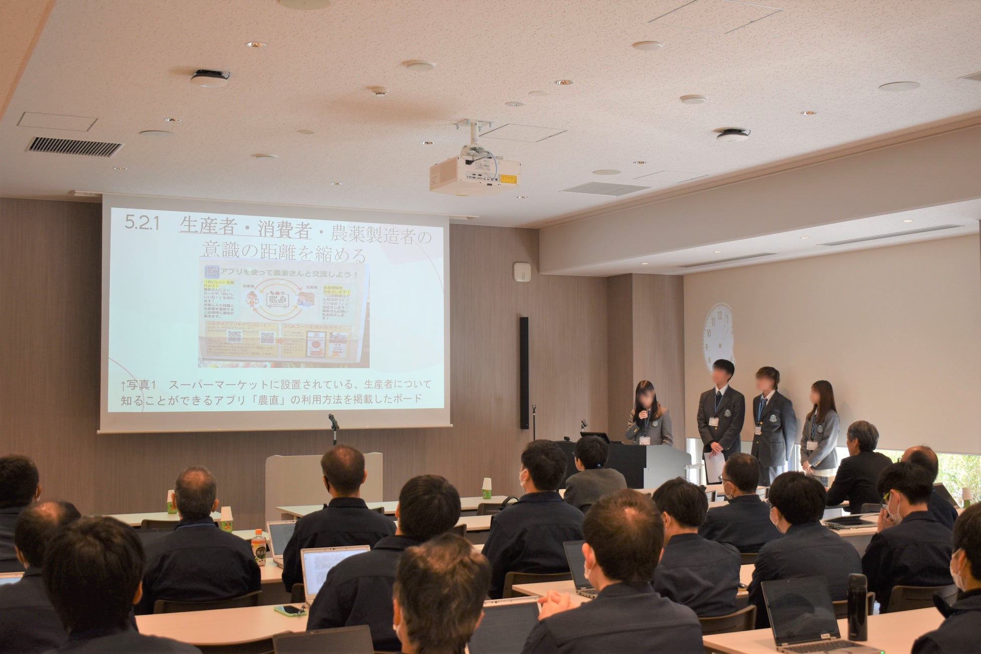 当社は、世界の⾷料・農業を⽀える企業として未来を担う高校生の皆さんと⼀緒になって、⾷や農業に関する問題を考えるため、2024年6月から11月にかけて「高校生のための食育プログラム 食料生産に関するグループディスカッション」を実施いたしました。全98グループ433名が本企画に参加し、提出されたレポートを当社事務局で審査した結果、都内の私立高校のグループのレポートが優秀賞として選出されました。2025年2月4日(火)には、優秀賞レポートを作成した高校生を当社の化学研究所(Shimizu Innovation Park/ShIP、静岡市清水区)に招待して表彰式を開催し、会社紹介、所内の見学、質疑応答や当社役員・研究員との交流を行いました。質疑では多くの質問が寄せられ、研究や農薬についての理解をより深めていただく機会となりました。