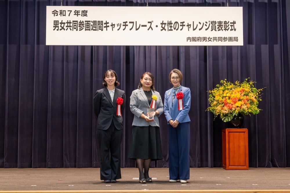 表彰式は2025年6月27日に内閣府中央合同庁舎で実施され、三原じゅん子内閣府特命担当大臣(男女共同参画)・女性活躍担当大臣より表彰状と記念の盾をいただきました。