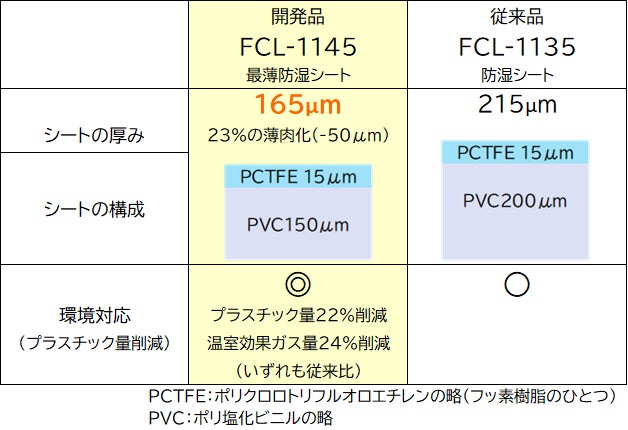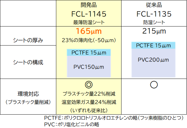 医薬品包装用シート「スミライト®FCL」は、基材となるPVC(ポリ塩化ビニル)に、フッ素樹脂フィルムを複合した、高防湿性を特長とする製品です。本製品スミライト®FCL -1145では、高防湿性に加え、透明性、成形加工性などの諸機能を維持しつつ、使用する樹脂量を約22%軽減しました。これに伴うCO2排出量の削減は約24%となります(詳細は次ページのグラフ参照)。また薄肉化することにより、PTP包装における錠剤の取出し性改善も期待できます。
