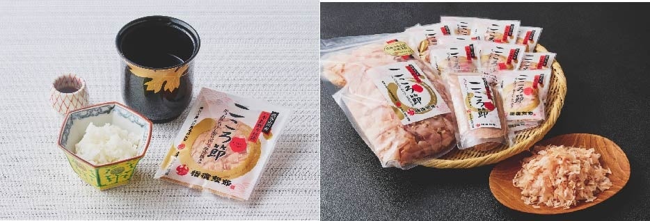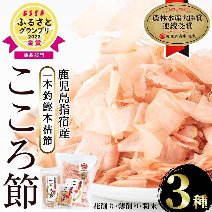 今回の受賞品は「こころ節」シリーズの人気3商品の詰合わせ。一本釣した鮮度の良い貴重な鰹を原料に、じっくりと半年もの時間をかけ、熟成させた最高級鰹本枯節を、ご家庭でも食べやすいように加工しました。化学調味料、添加物は一切使用しておりません。