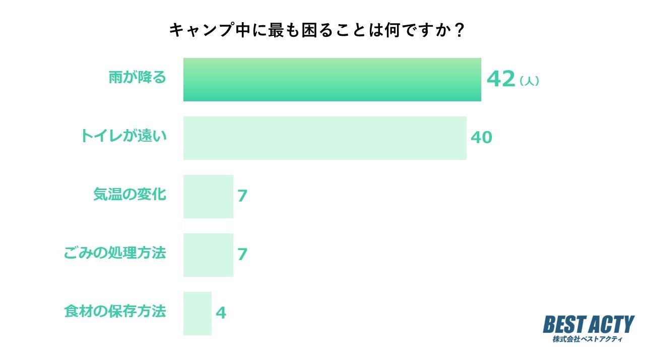 キャンプ中に最も困ることについて100名にアンケートを行ったところ、「雨が降る」と回答する人が最も多い結果となりました。