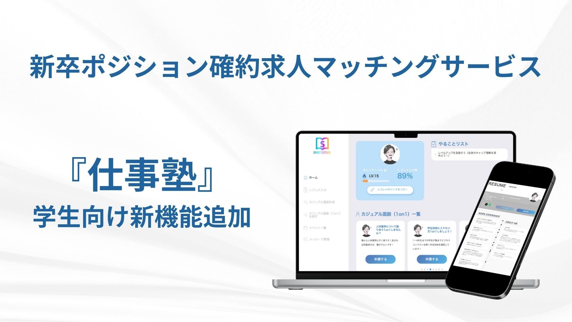 新卒採用に「ポジション確約採用」を提案するgoodluck株式会社(本社:東京都新宿区、代表:高村一光)は、職歴を持つ学生と企業をマッチングする就活プラットフォーム「仕事塾」で新たに3つの新機能を追加しました。