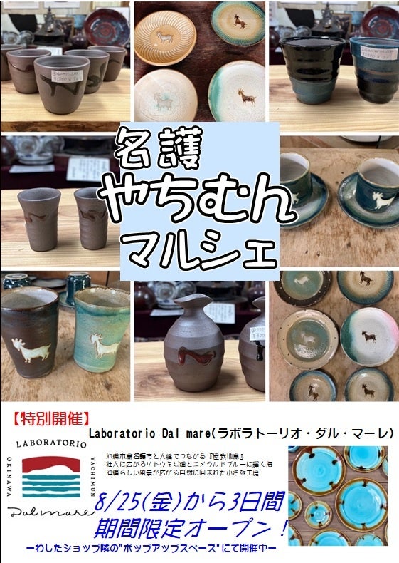 また、同日開催するポップアップ「Laboratorio Dal mare(ラボラトーリオ・ダル・マーレ)」では、沖縄本島名護市と大橋でつながる『屋我地島』にある、沖縄らしい風景が広がる自然に囲まれた小さな工房から、ひとつひとつ大切に作り上げた「やちむん」を札幌のみなさまへお届けいたします。