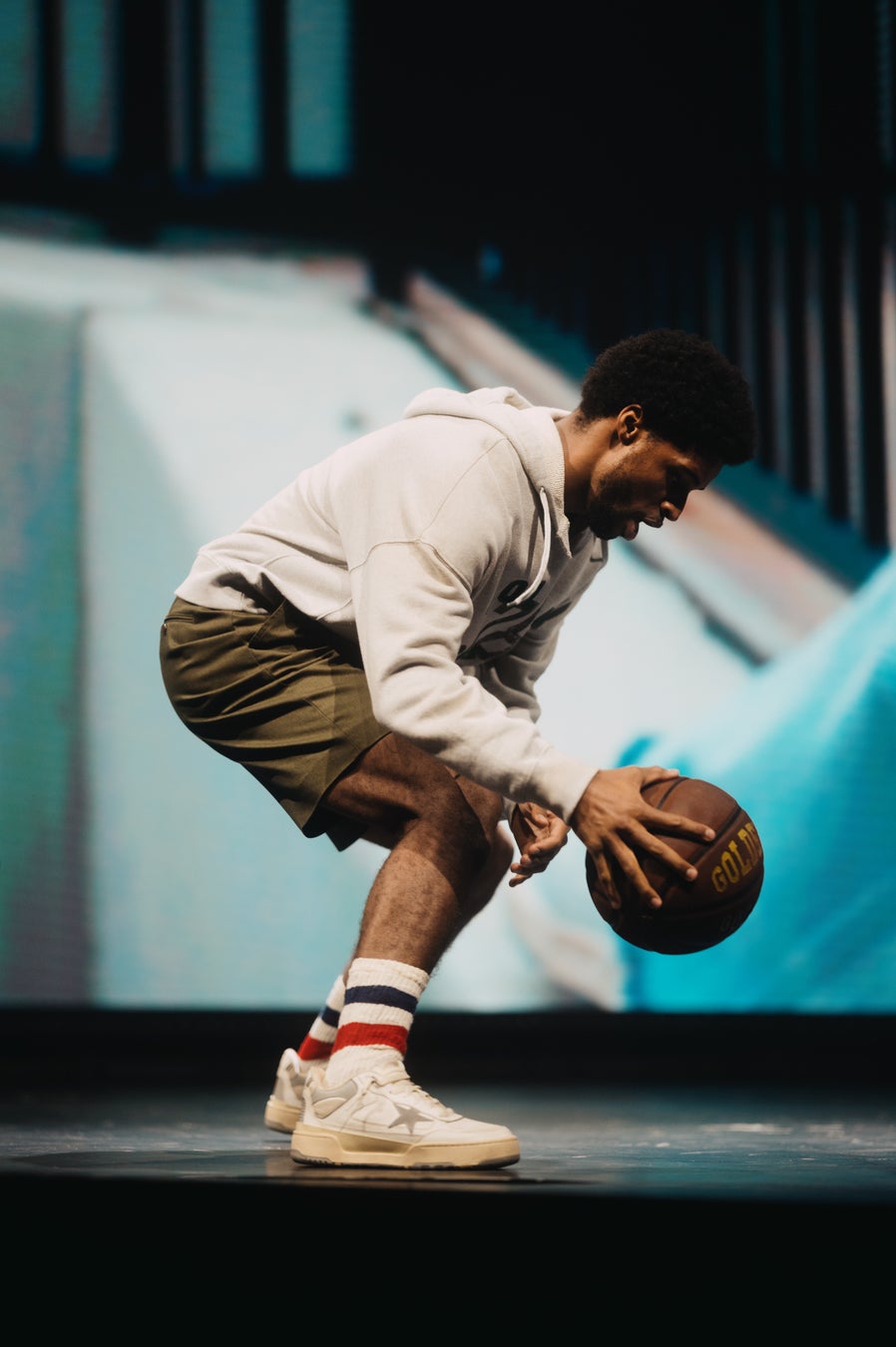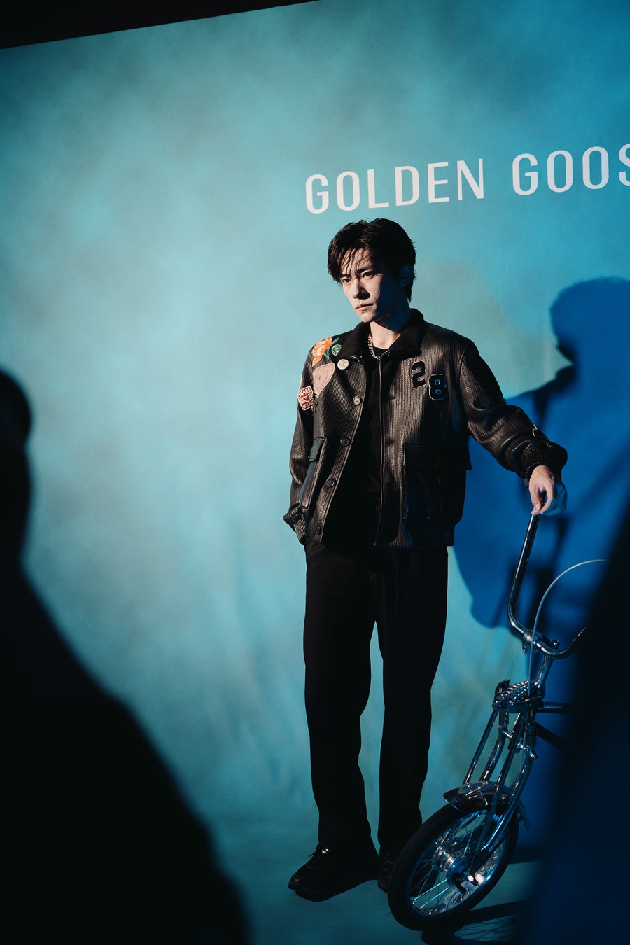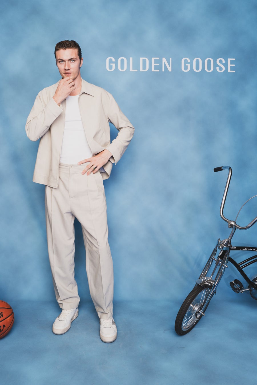 パフォーマンス中、ゴールデン グースはSS25ジャーニーコレクションを発表し、注目の「FORTY2(フォーティ2)」スニーカーを含む新作を俳優たちが着用して披露。フォーティ2は、90年代のスタイルを現代の夢追い人向けに再解釈したもので、アメリカのバスケットボール黄金時代からインスパイアされたそのボリューム感のあるデザインは、タイムレスなファッションを表現しています。このスニーカーは、ゴールデングースの職人によって手作りされており、二重のボックス状のソールに、分解構造の三色のポリウレタンを使用しています。アッパー部分には、カーフレザーとマイクロパーフォレート素材が組み合わされ、独特な触感を作り出し、星とヒールタブには立体的なテクスチャが施されています。