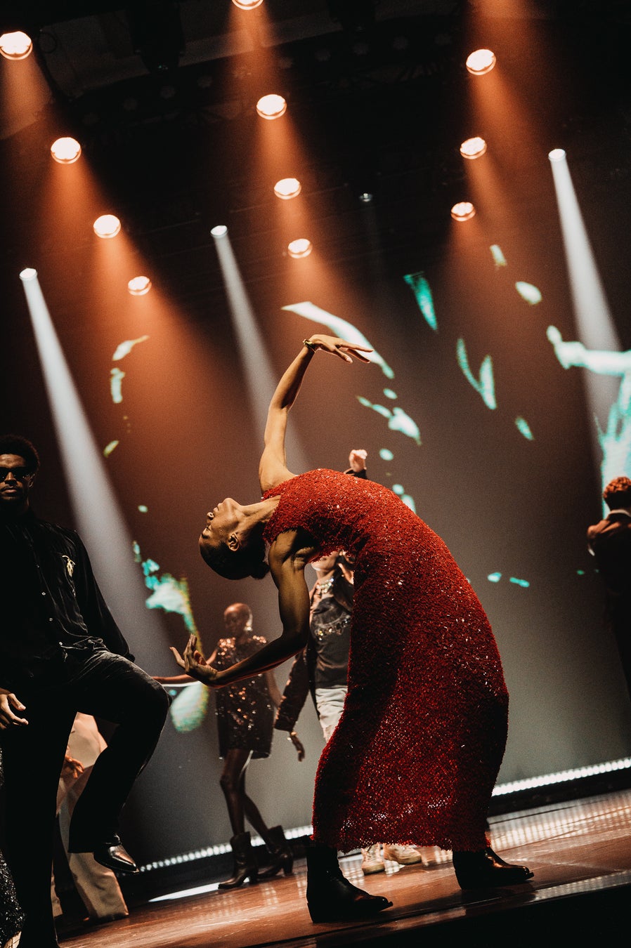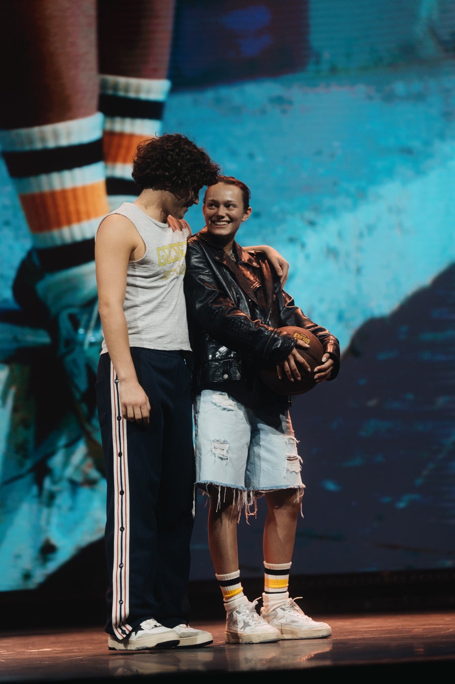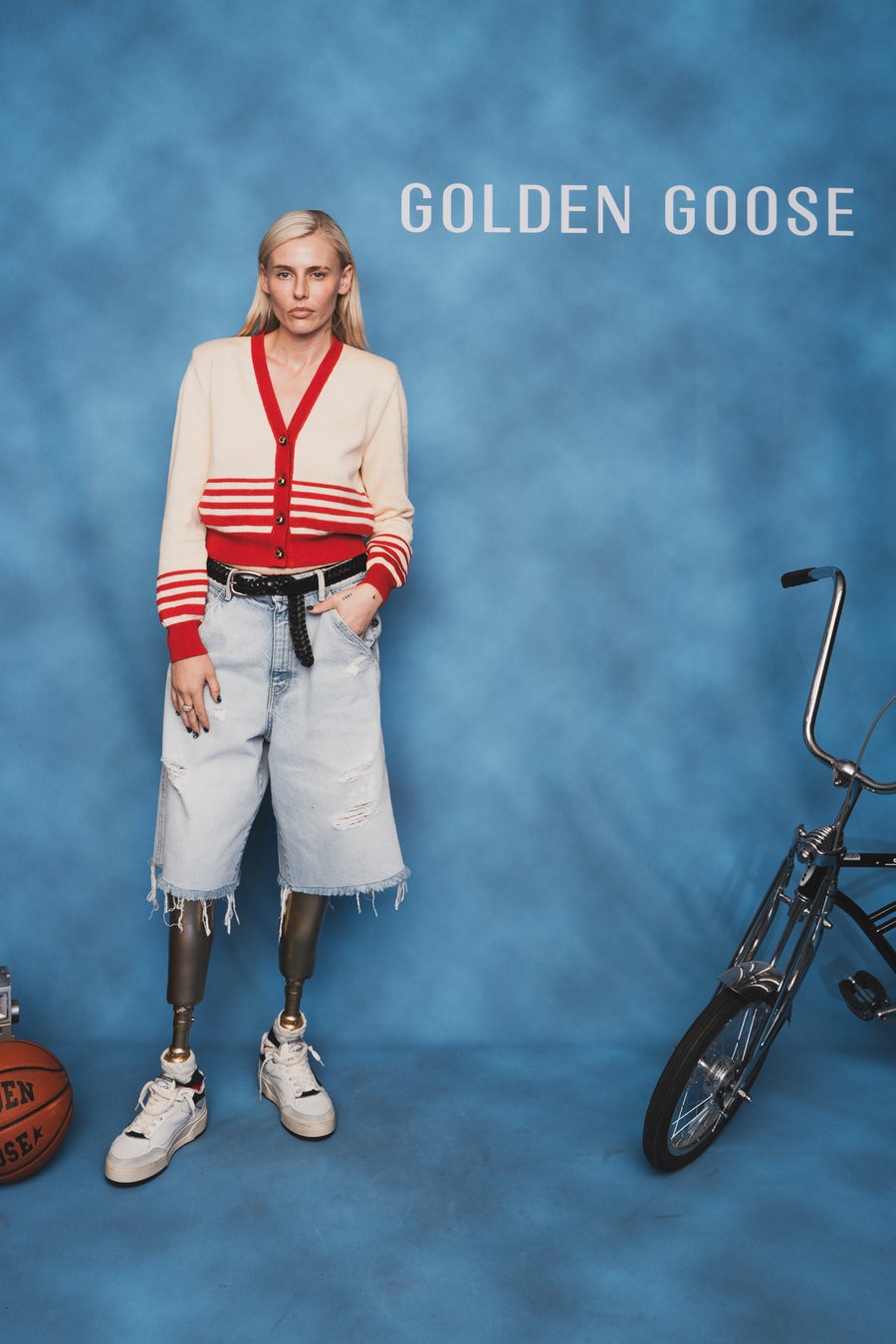 パフォーマンス中、ゴールデン グースはSS25ジャーニーコレクションを発表し、注目の「FORTY2(フォーティ2)」スニーカーを含む新作を俳優たちが着用して披露。フォーティ2は、90年代のスタイルを現代の夢追い人向けに再解釈したもので、アメリカのバスケットボール黄金時代からインスパイアされたそのボリューム感のあるデザインは、タイムレスなファッションを表現しています。このスニーカーは、ゴールデングースの職人によって手作りされており、二重のボックス状のソールに、分解構造の三色のポリウレタンを使用しています。アッパー部分には、カーフレザーとマイクロパーフォレート素材が組み合わされ、独特な触感を作り出し、星とヒールタブには立体的なテクスチャが施されています。