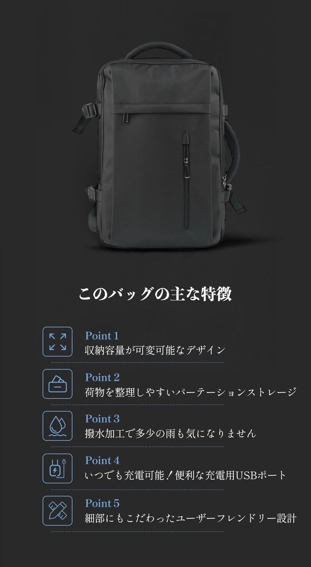 容量拡張可能なこのバックパックは、撥水加工されているので雨の日も気にせず旅行や出張ができます。さらに専用のレインコートも付属しているので、ご自身が雨に濡れるのも防ぎます。容量拡張が自由にできるので普段の出勤や通学から出張や旅行までシーンを選ばずご使用いただけます。