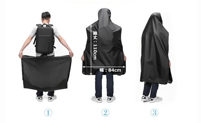 このバックパックには、雨天時にも対応可能なポータブルレインコートが付属しています。傘を持たずに外出し、急に雨が降ったときにはバック底にあるレインコートを引き出してかぶれば、雨をしのぐことができます。